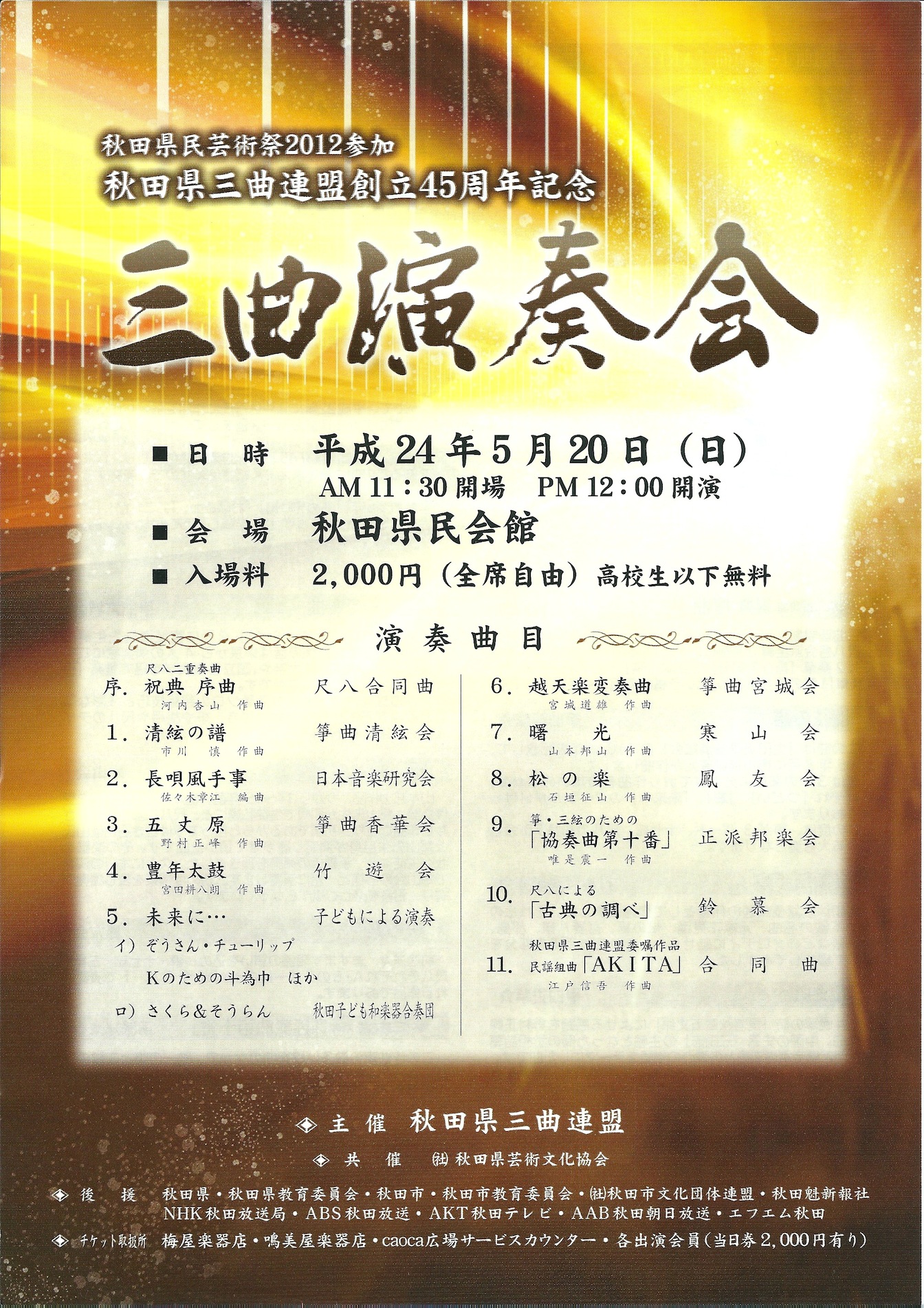 平成24年5月20日(日)正午より、秋田県民会館にて秋田県民芸術祭2012参加、秋田県三曲連盟創立45周年記念「三曲演奏会」が開催されます。入場料は2,000yen(全席自由)、高校生以下無料となっています。