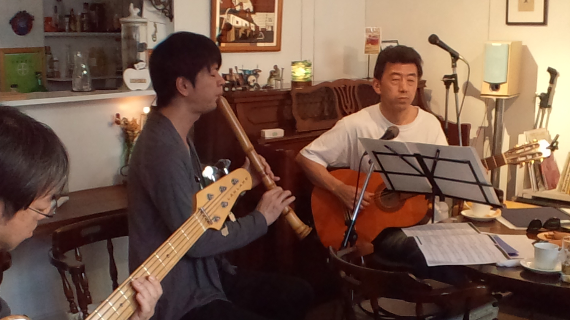 昨日、J’s cafeにお馴染みのミュージシャンが集合していると聞き、僕も顔を出しました。新パンデイロは勿論ですが、久しぶりに尺八を持ち込みです。