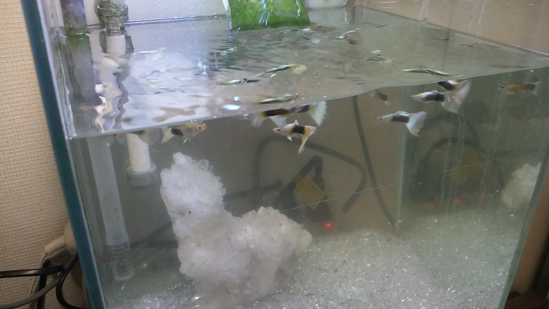 底床を1年近く水に浸したさざれ水晶にしました。でも、ろ過バクテリアがうまく発生してくれるのか、まだ判りません。