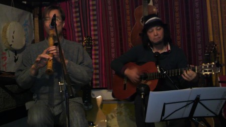先日、秋田駅前のアート&カフェ・ティエラにて、フォルクローレ系ギタリストのアルマンド山平さんと尺八のブルース・ヒューバナーさんのユニット「Forest Note」のライブがありました。