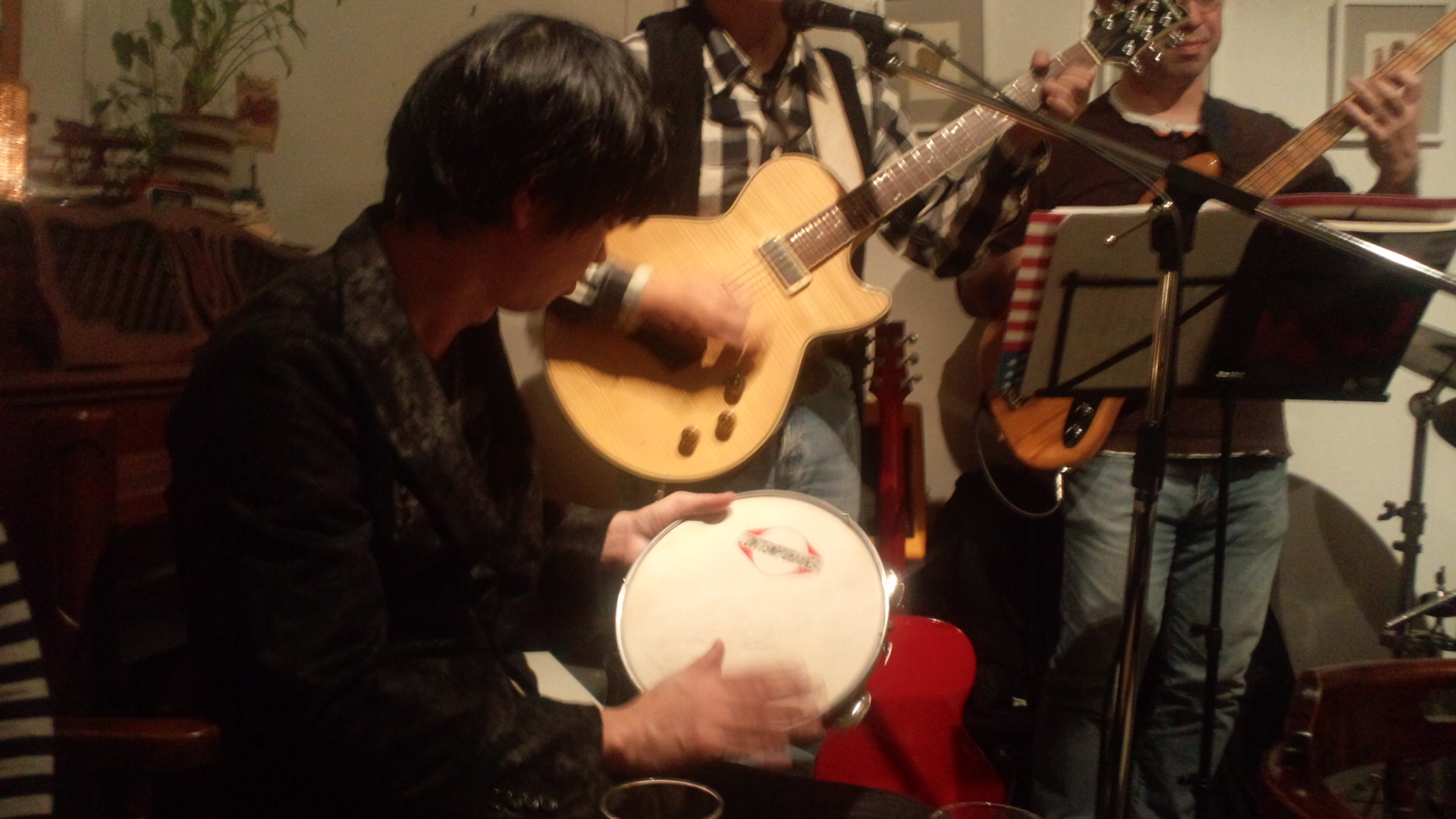 先日、J’s cafeのギャラリー発表会の打ち上げがありました。宴会と演奏がスタート!!! お声が掛かりパンデイロを叩きます。